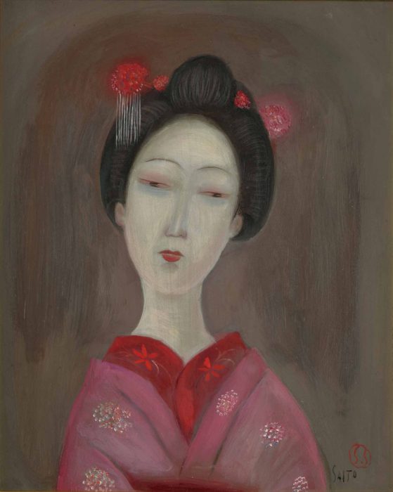 ほの暗い背景、簡素な着物、泣き疲れたような空虚な眼差し。一目でこの女性が置かれる状況が伺えます。養祖母が明治二十年代に吉原で花魁をしていた影響から、斎藤は生々しい矛盾を抱え、華やかさに陰りを見せた明治の吉原に関心を寄せました。めまぐるしい時代の波に翻弄され忘れ去られた吉原の女の悲哀を、彼は絵にすることで掬い取らんとしたのです。
