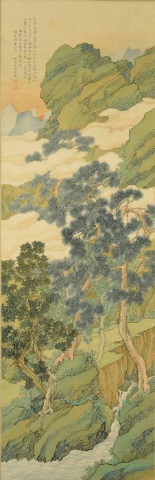 天保九如は中国の『詩経』に登場する、山川や日月など永続的な九つの事物を挙げ、天子の長寿を祈る詩に基づく画題です。本作は青々と繁る松柏と、淡彩の太陽と三日月が対照をなし、気品ある理想的山水を体現しています。桂月独特の右上から左下へと連なる画面構成は、右上がりの書風と相まって流麗な印象です。山や雲は光を浴びて輝くかのように金泥でなぞられ、一層のめでたさを添えています。